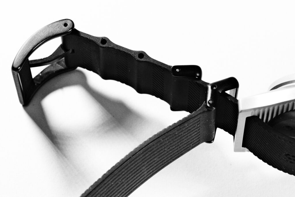 This also allows the strap to be transformed from a single pass to a double-pass-through strap. The advantages of a double pass-through design include creating a buffer between one’s wrist or exposure suit and the springbars that hold the watch to the strap, thereby protecting the spring bars. It also elevates the case of the watch from one’s wrist, which, for most people, may be seen as detrimental or unsavoury, but in professional settings, this is quite helpful.